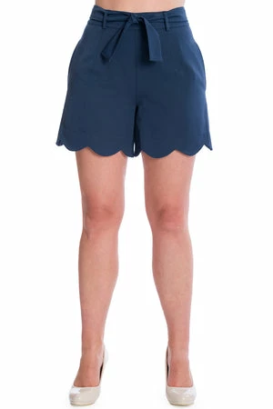 The shorts have scalloped trim detailing, ribbon tie detailing, side pockets, back zipper fly with button closure and a figure accentuating fit.