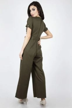 The rockabilly jumpsuit has a V-neckline, side pockets, back pockets, a figure accentuating shape and it fastens at the front with buttons.
