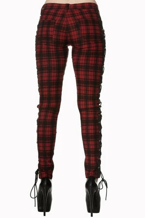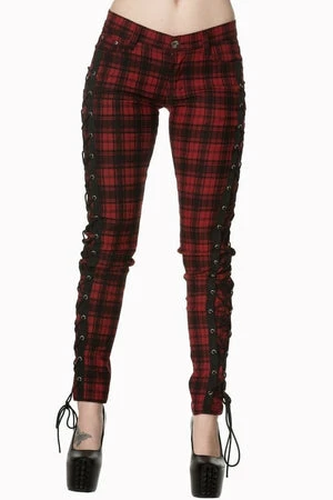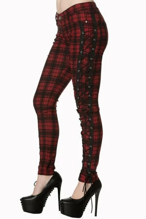 Just look at these kickass, gothic, ladies trousers made by Banned the “escaping darkness tartan skinny trousers”. This style is made in red tartan and features corset style ties at the sides.