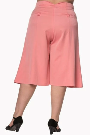 Check out these lovely, rockabilly style, ladies, flared short trousers, designed by Banned the “eve plus size trousers”, in an appealing coral pink colour, with front button details, back pockets and a hidden zipper at the side to fasten.