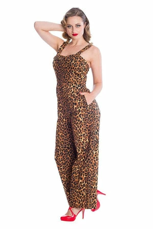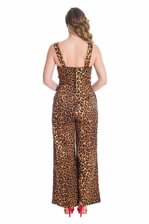 The vintage jumpsuit has leopard themed print, a sweetheart neckline, side pockets, a figure accentuating shape and it fastens at the back with a zipper.