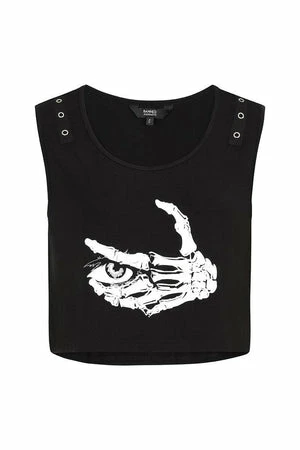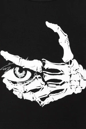 The dark crop top has creepy eyes and skeleton print, shoulder eyelets detail, a crew neckline and a relaxed fit.