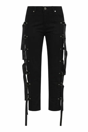 These high waist skinny trousers have gothic themed design, front pockets, back pockets, belt loops detailing, a figure accentuating shape, d-ring and straps detailing and it fastens with a zip fly at the front.