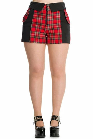 The dark shorts have tartan design, front and back pockets, a zipper fly with button closure and a figure accentuating fit.