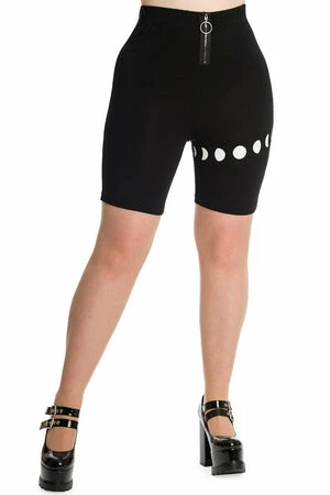 The dark shorts have Moonphase design on the side, front and back pockets, a zipper fly and a figure accentuating fit.