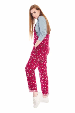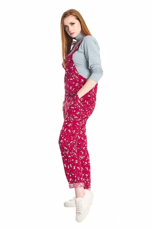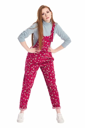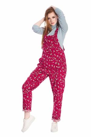 The rockabilly jumpsuit has floral design, a square neckline, side pockets, back pockets, adjustable straps and a figure accentuating shape.