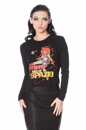 The crop top has retro horror movie inspired design, a crew neckline, long sleeves and a figure accentuating fit.