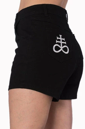 This is a slammin’ hot pair of black, high waist, Gothic shorts from Banned Apparel, the “Sulphur Shorts”, with white occult symbols embroidery on the back pockets. The woven shorts have a front zipper and button fly.
