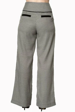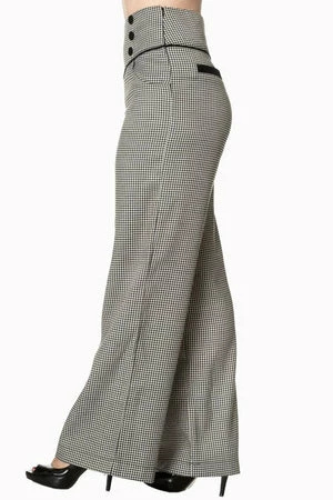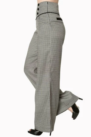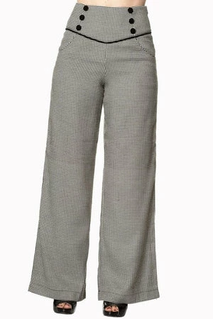 Just look at these outstanding vintage ladies trousers from Banned Apparel, the swept off her feet wide leg trousers. This style has a black or red houndstooth pattern, with contrast front decorative buttons, piping and back pockets.