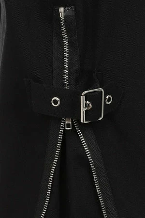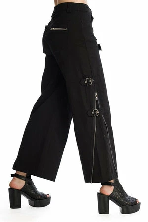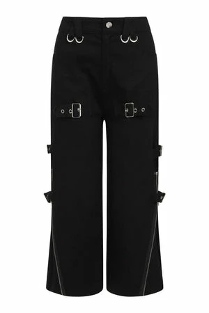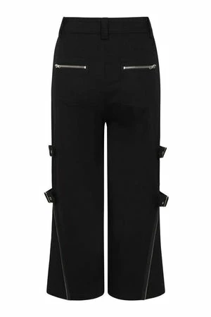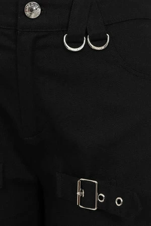 These low waist trousers have gothic themed design, front pockets, back zip pockets, belt loops detailing, a figure accentuating shape, d-ring details and it fastens with a zipper at the front.