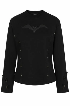 The gothic sweater has bat design, stud and eyelets detailings, crew neckline, long sleeves, ribbed cuffs and a figure accentuating shape.