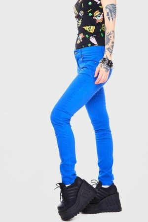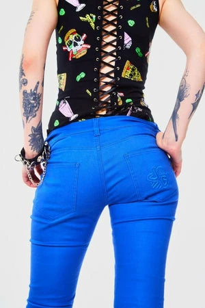 Kickass, blue punk style skinny jeans from jawbreaker, the style has front and rear pockets and an embroidered detail over the back pocket. They are made in a stretchy soft cotton mix for a superb fit.