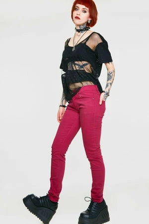 These burgundy coloured, punk style jeans from jawbreaker, have a skinny fit and are also available in other colours. They have front and back pockets and an embroidered detail over the back pocket, and are made in a stretchy soft cotton mix for a superb fit.