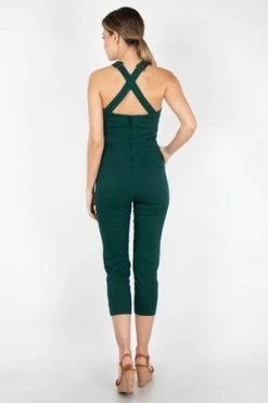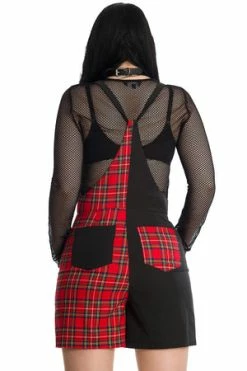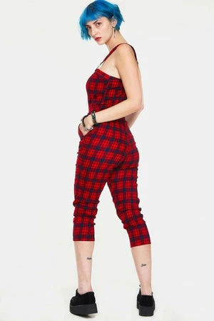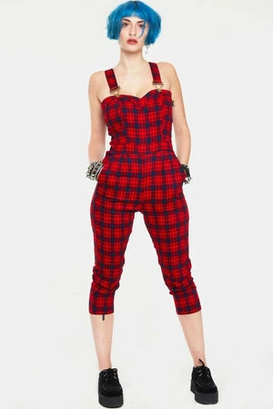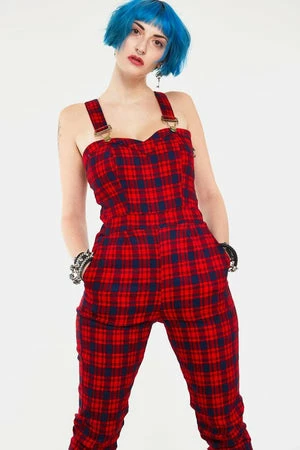 This sleeveless jumpsuit has red tartan print, sweetheart neckline, adjustable straps, side pockets and it fastens with a hidden zipper at the back.