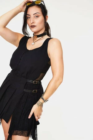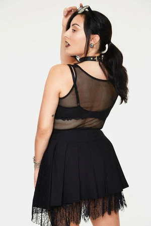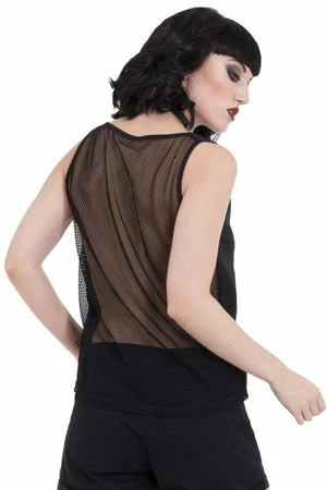 A slammin’ black tank top from Jawbreaker, with hooks to fasten at the front, a scooped neckline and a fishnet back.