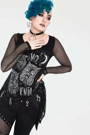 This dark top has evil cats design, back skull net lace detail, a round neckline, long net sleeves and a flattering fit.