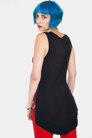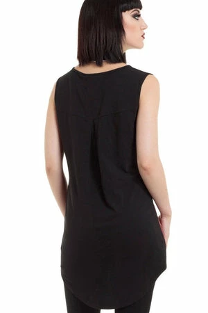 This top is black and sleeveless, with a cut out detail on the neckline, the material is 95% cotton and 5% elastane for comfort and stretch.