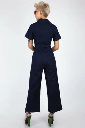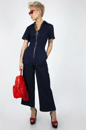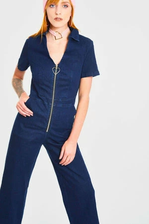 This jumpsuit has a V-neckline, short sleeves, pockets, flared legs and it fastens with a heart zipper at the front.