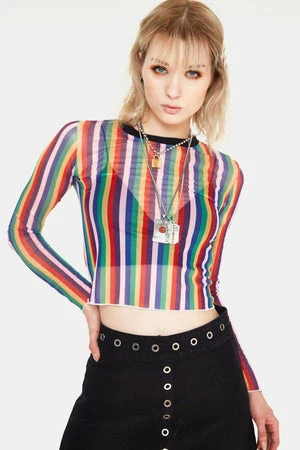 This mesh top has a multicolored striped print, a crew neckline, long sleeves and a figure accentuating shape.
