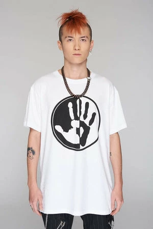 An imposing, white unisex t-shirt from Long Clothing. This t-shirt has a fierce black and white hand print at the front.