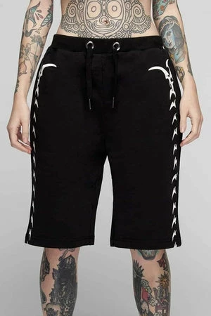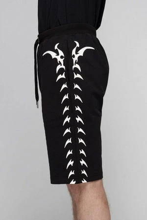 A phenom pair of unisex shorts from Long Clothing called “Exo”, in black with a white tribal style spinal print at the sides.