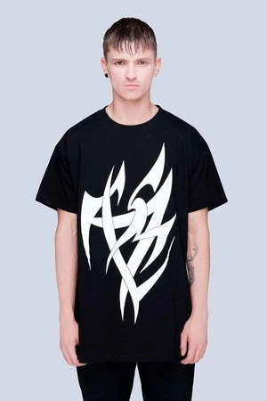 Klan, an awesome unisex t-shirt from Long Clothing, made in black cotton, with a white print on the front of a large abstract tribal design and a spinal style tribal print on the back.