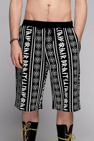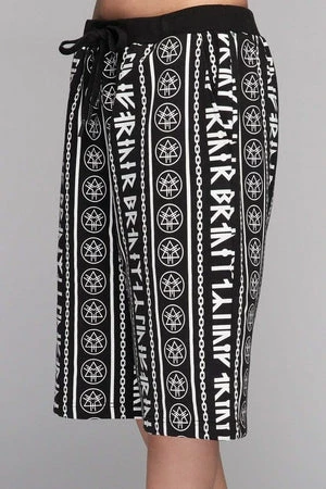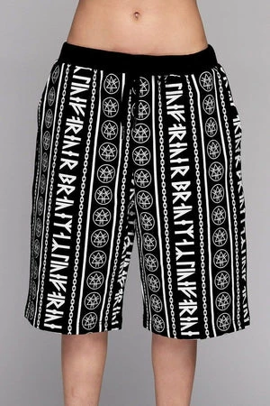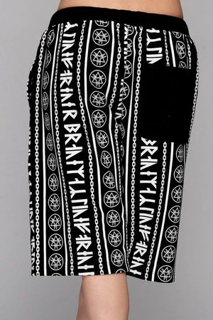 An ace pair of unisex runic design shorts from Long Clothing, in black with a white print of runic writing and link chains.