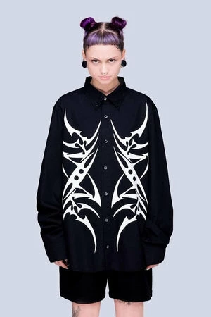 This is an awesome 100% cotton black, unisex, buttoned shirt from Long Clothing which has a formidable tribal design on the front.