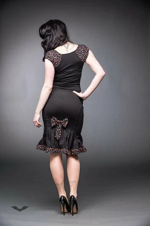 The black top has a cherries and stars themed print on the shoulders, a cherry with a bow on the bust line, short sleeves and a figure hugging shape.