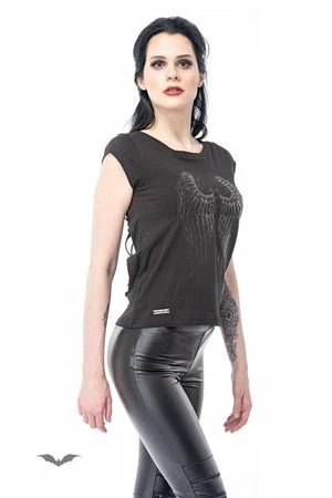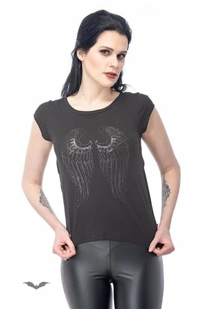 A wicked tee inspired by angels and designed by Queen of Darkness. An awesome print of angel wings are on the front of this shirt, with transparent lace wings on the back, giving this shirt some unique character.