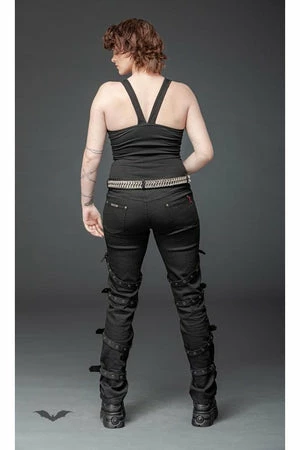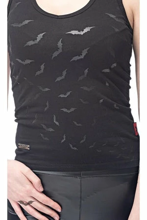 A wicked design for any vampire, this sleeveless top is created by Queen of Darkness. On the front is a print of many flying bats, and the back of the top is open cut.