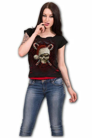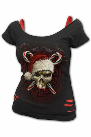 This 2in1 knitted, off shoulder top is made from the highest quality, and the knit uses skin friendly, azo-free, reactive dyes. Featuring Candy cane Santa print, rip detail and a flattering shape.