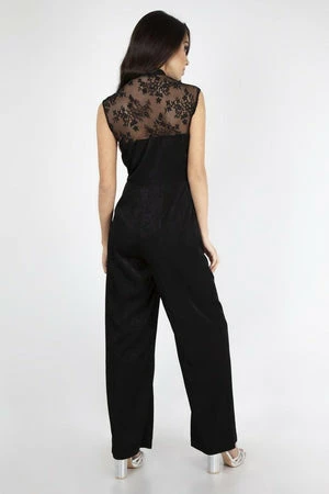 This satin jumpsuit has lace detailing, a satin sweetheart neckline, neck tie detail, contrast clutch and it fastens at the front with an invisible zipper.