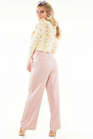 These retro low waisted trousers have pink plaid print, oversized bow detail, pockets, belt hoops and it fastens with a front zipper.