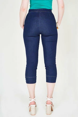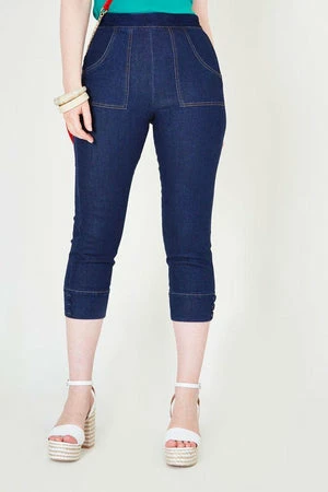 These dark denim pants have pockets, button detailing and it fastens with a side zipper.
